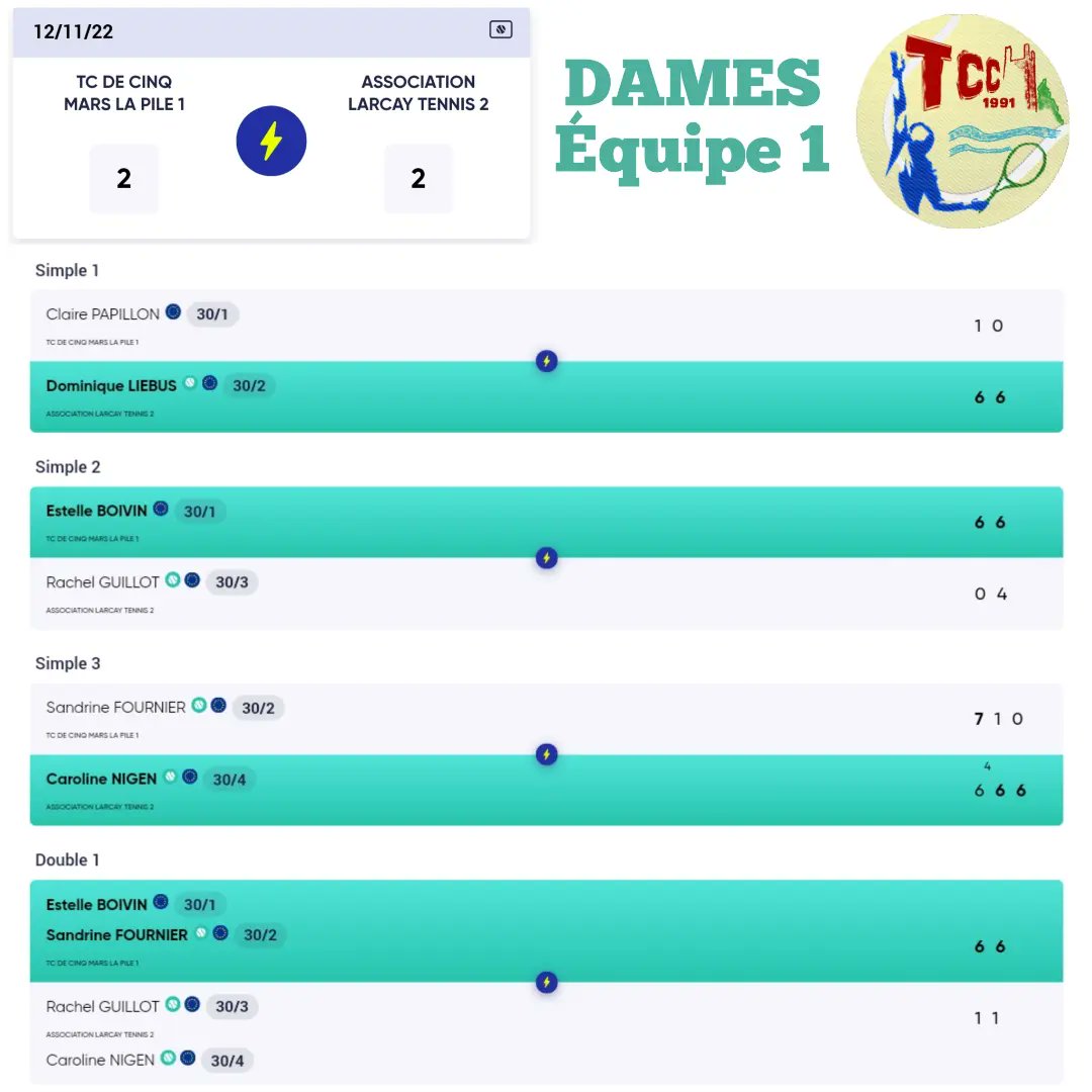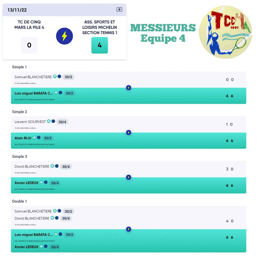 - Équipe 4 : défaite 0-4 contre ASL Michelin Joué Lès Tours 1