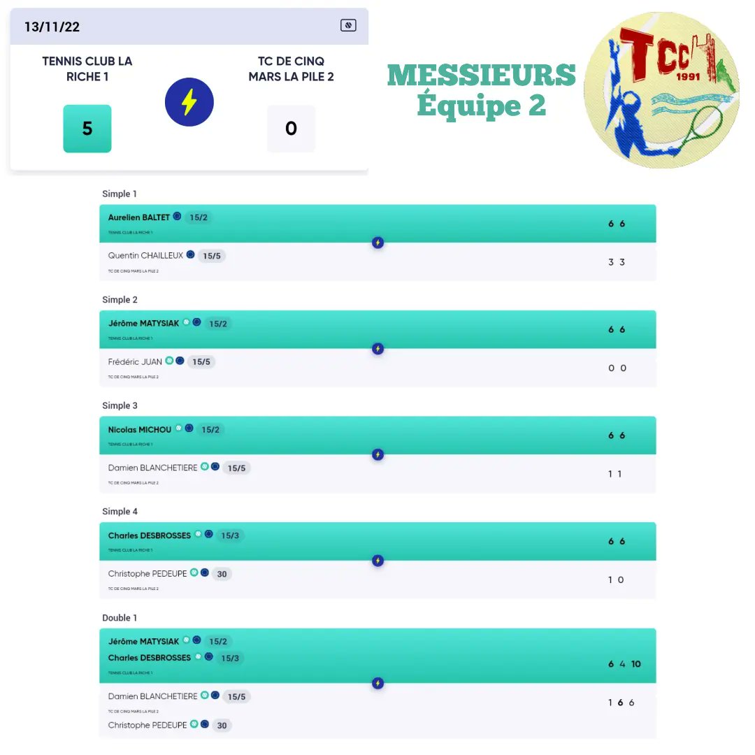 - Équipe 2 : défaite 5-0 contre La Riche 1