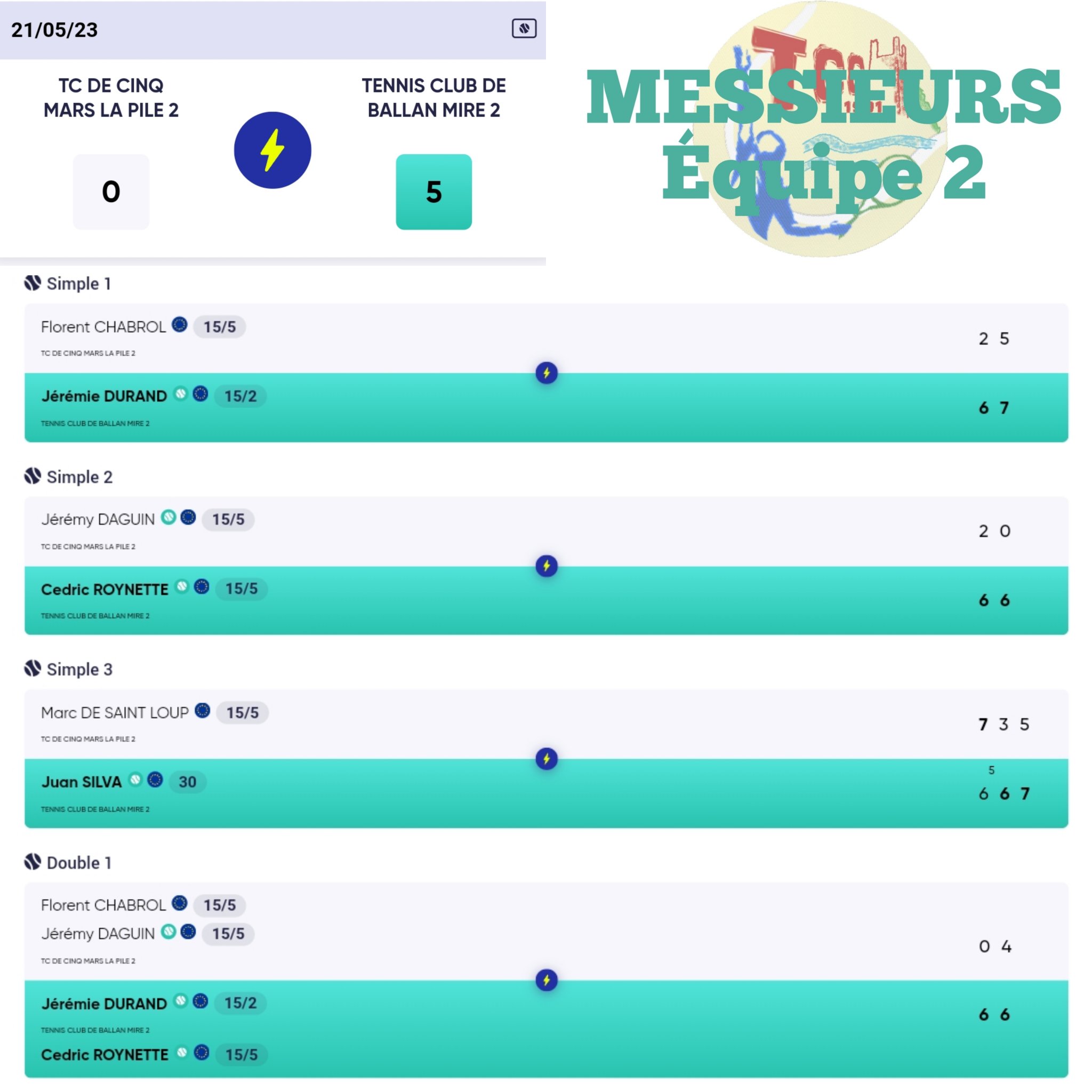 - Équipe 5 : forfait 0-5 contre Ballan Miré 5