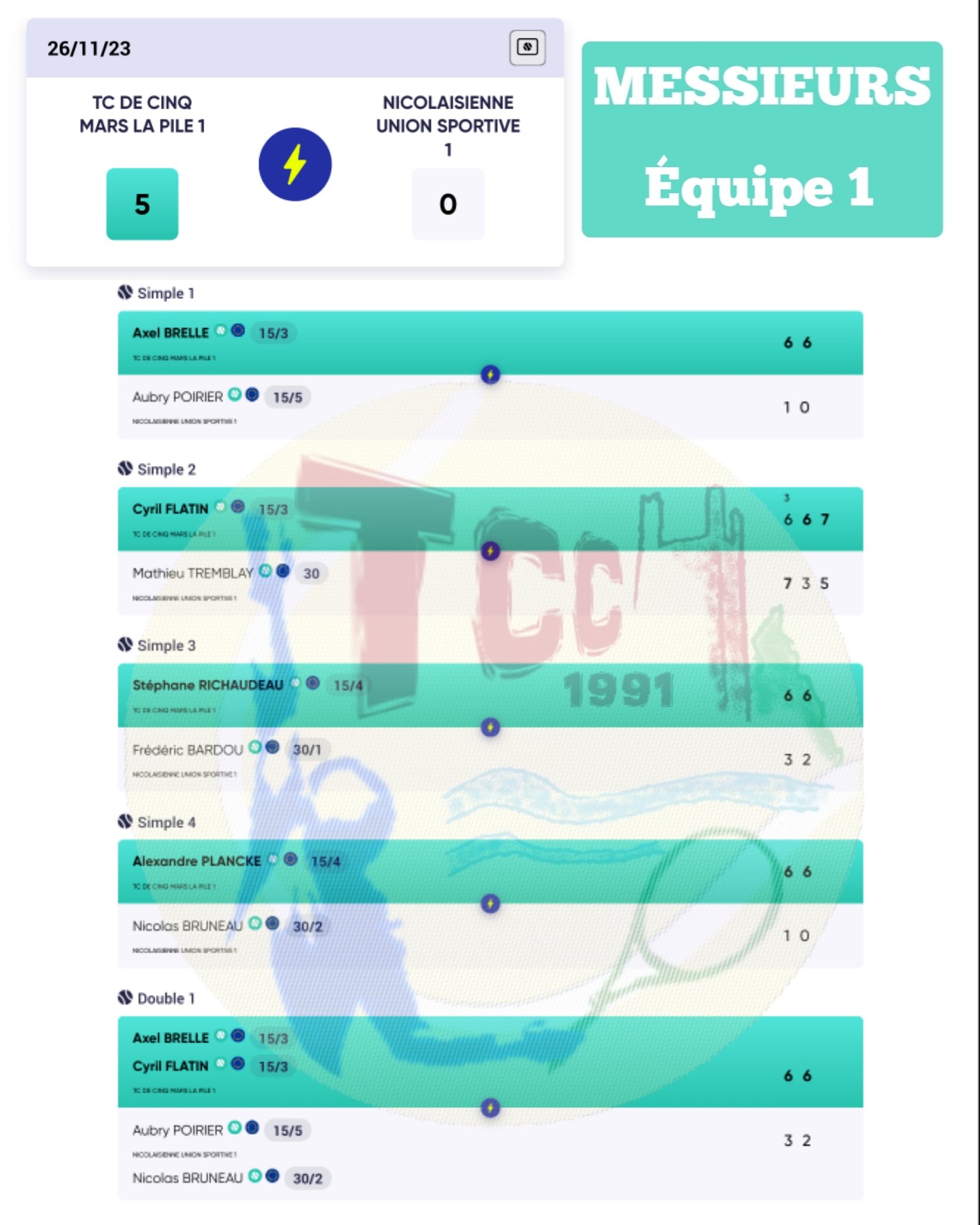 - Équipe 1 : victoire 5-0 contre SAINT NICOLAS DE BOURGUEIL 1 😀