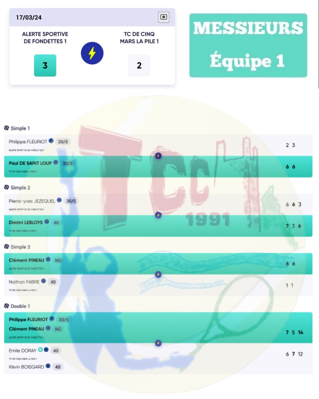 Équipe 1 : défaite 2-3 contre FONDETTES 1