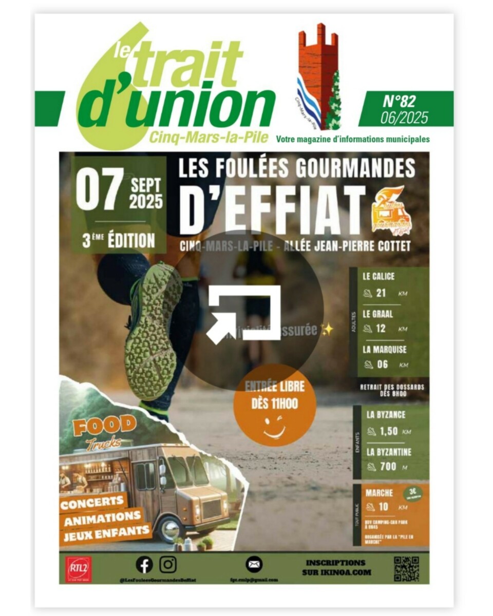 Retrouvez la version en ligne du Trait d'Union n°82 de juin 2025, bulletin municipal de la Ville de Cinq Mars la Pile !