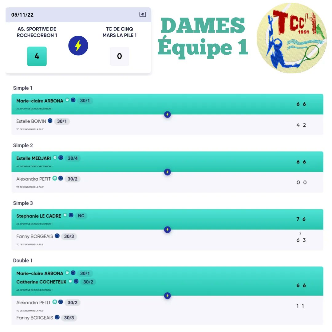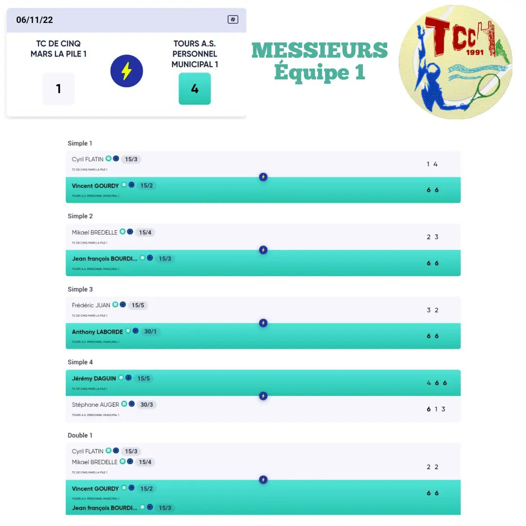 - Équipe 1 : défaite 1-4 contre ASPM Tours 1