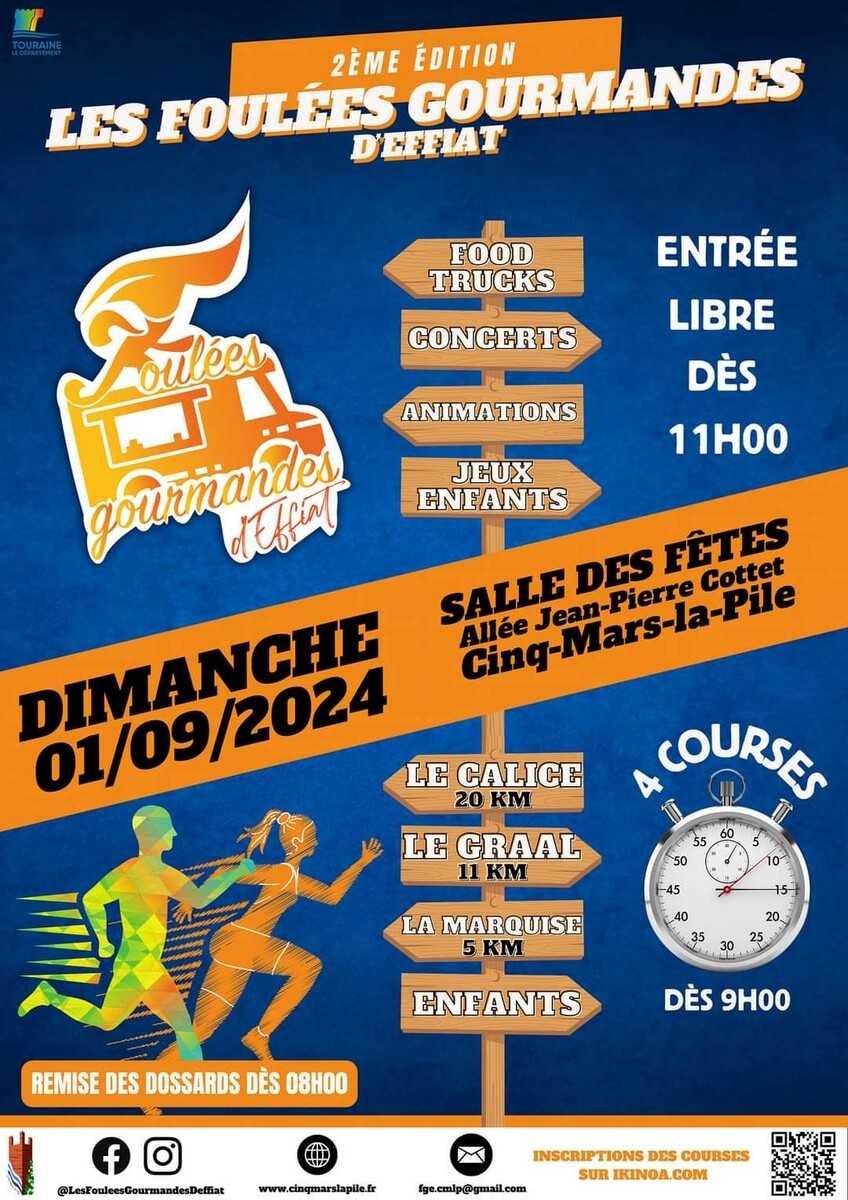 Le dimanche 01/09/2024, la ville de Cinq Mars la Pile organise la 2ème édition "Les Foulées gourmandes d'Effiat". Afin d'innover et de faire participer le plus grand nombre de personnes, l'organisation propose un challenge associatif.