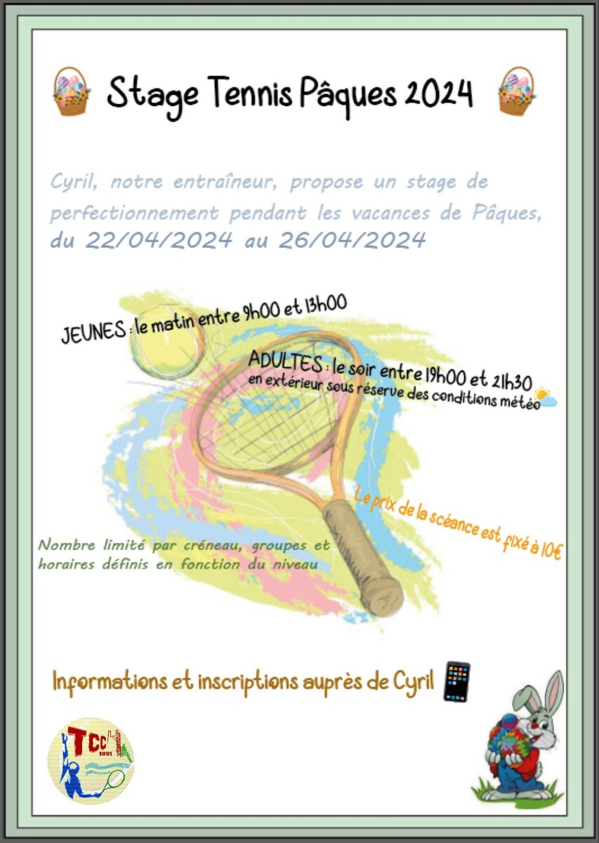Cyril, notre entraîneur, propose un stage de perfectionnement pour nos licencié(e)s pendant les prochaines vacances scolaires :
